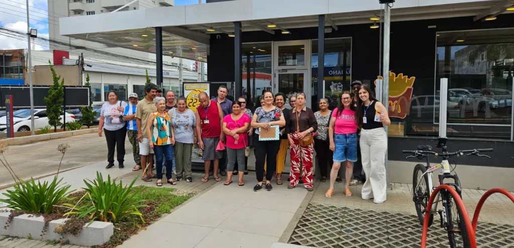 Os participantes viveram uma tarde especial durante um passeio em uma empresa de fast food, marcada por conversas, troca de experiências, momentos de descontração e uma sobremesa compartilhada, tornando a atividade uma experiência inclusiva e significativa.